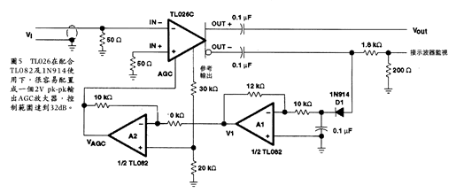 TL026在一个8脚封装里提供差分输入与差分输出,它有50MHZ频宽、38dB最大增益及50dB的AGC范围,在其AGC针脚相对于参考针脚有±180MV的电压变化时,就会令其增益从最小变至最大——图5。